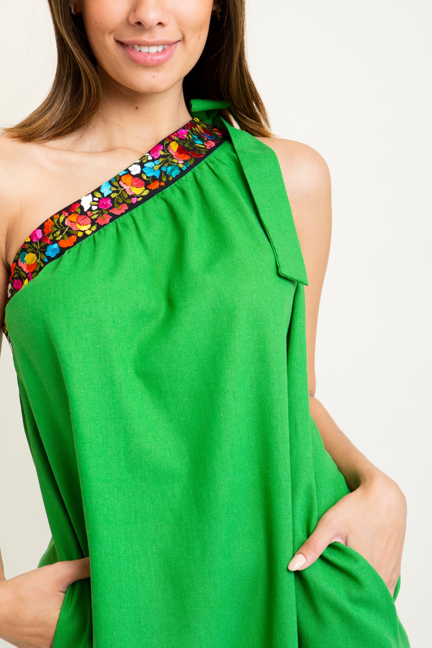 El tono verde vibrante de este vestido es irresistible, mientras que el amarre en el hombro añade un detalle encantador y único. Los bordados florales San Antonino, meticulosamente elaborados a mano por maestros artesanos, realzan la belleza de esta prenda, creando una obra de arte que te envolverá con su encanto.