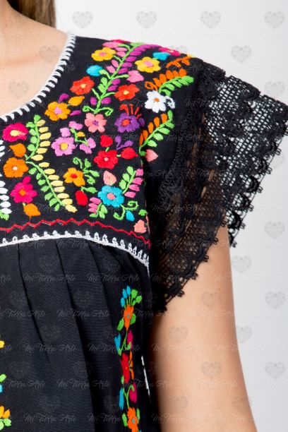 Vestido con bordado artesanal mexicano, confeccionado a mano en color negro por artesanas. Los artistas tejen un delicado bordado floral multicolor en forma de guía en la parte frontal. Las mangas y bastilla son adornadas con un hermoso encaje.