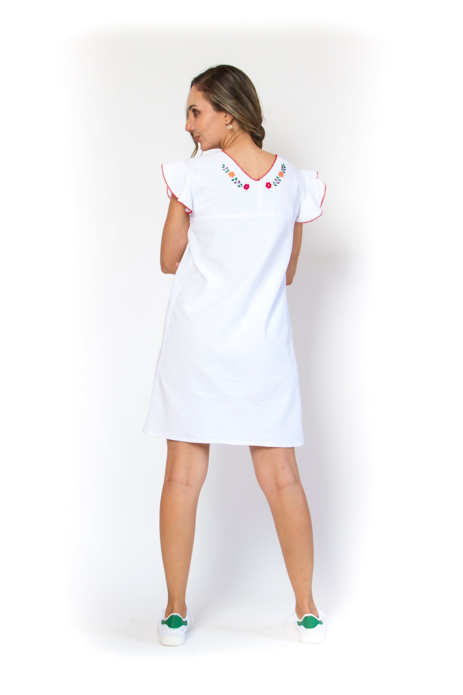 En color blanco, este vestido resalta el exquisito bordado floral multicolor, una verdadera muestra de maestría artesanal. Cada puntada es cuidadosamente tejida por talentosos artesanos de la región de San Gabriel Chilac, Puebla, quienes mantienen viva la rica tradición del bordado mexicano.